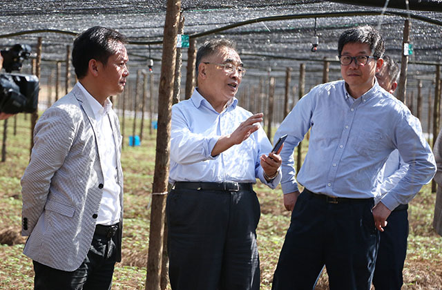 中國(guó)中醫(yī)科學(xué)院中藥研究所所長(zhǎng)陳士林(右一)、中國(guó)工程院院士張伯禮(右二)在苗鄉(xiāng)三七董事長(zhǎng)余育啟(右三)陪同下參觀苗鄉(xiāng)三七基地